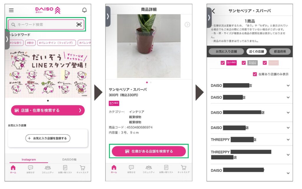 まずはダイソー公式サイトの店舗検索で、お住まいの地域の「大型店」に絞って目的地を決めるのがモンステラと出会うための近道です。