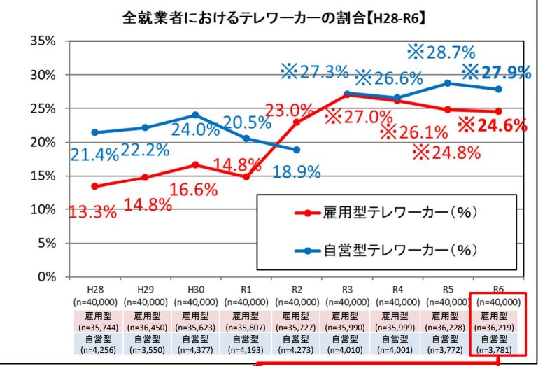 総務省「令和6年度テレワーク人口実態調査」によると、コロナ渦を機に雇用型・自営型テレワーカーを問わずテレワークを行う人の割合が増えており、快適な住空間ニーズが高まっていることがうかがえます。